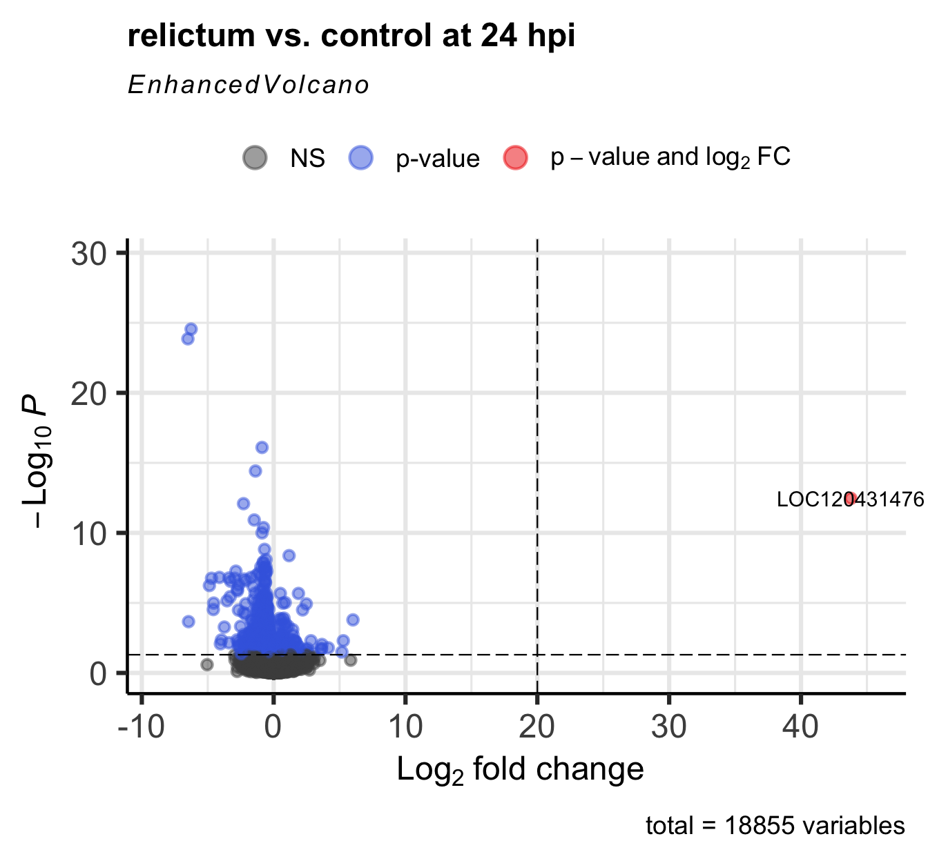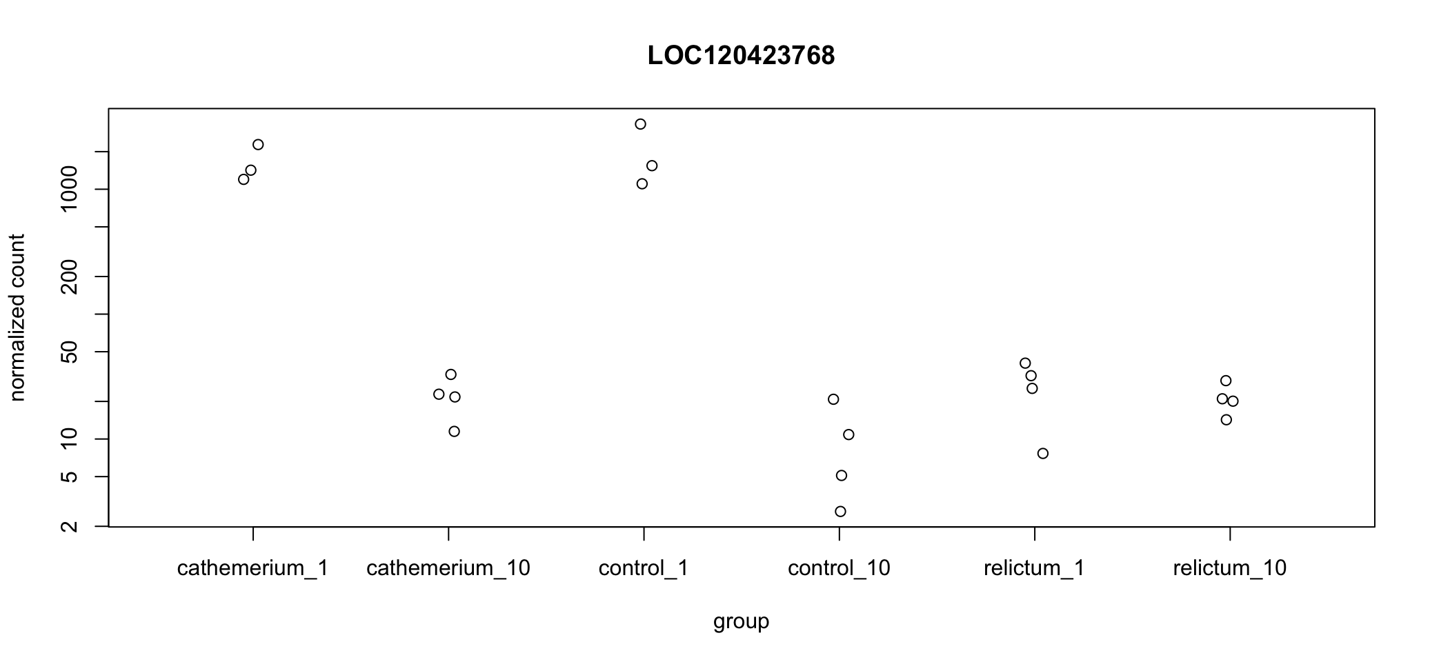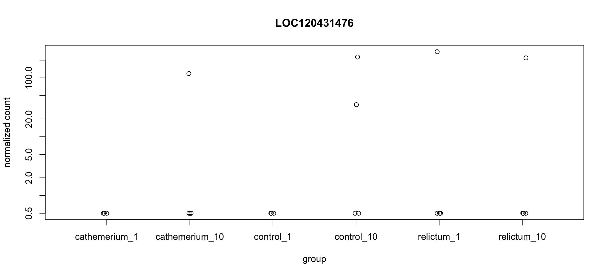 Our focal comparison is control_1 vs. relictum_1, and it looks like the difference between these two groups is solely due to the one outlier in relictum. Nevertheless, even the multiple-testing corrected p-value (padj) is significant for this gene: