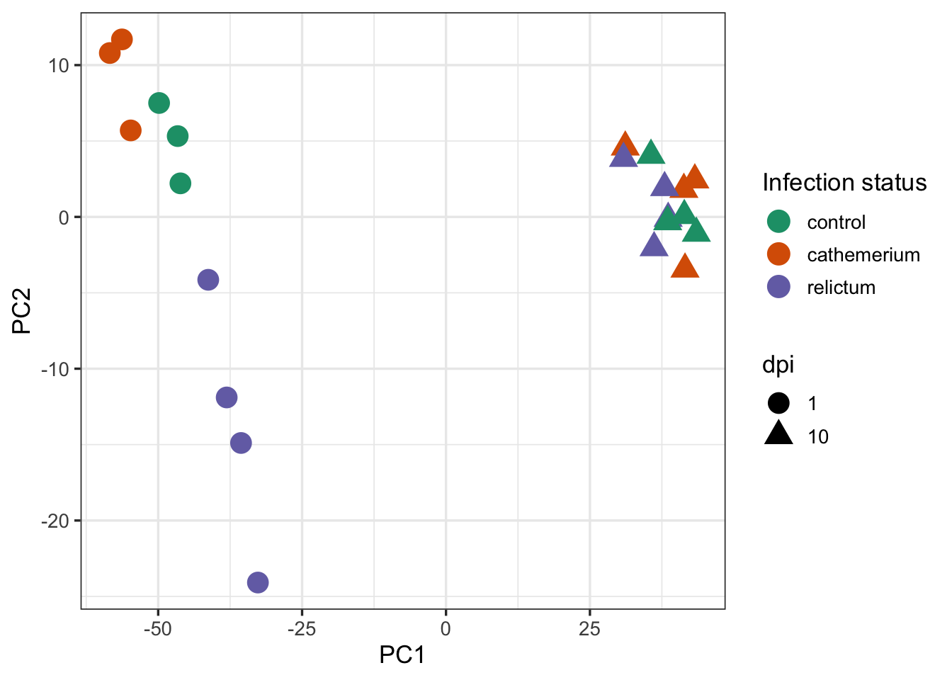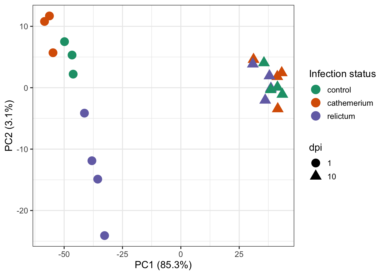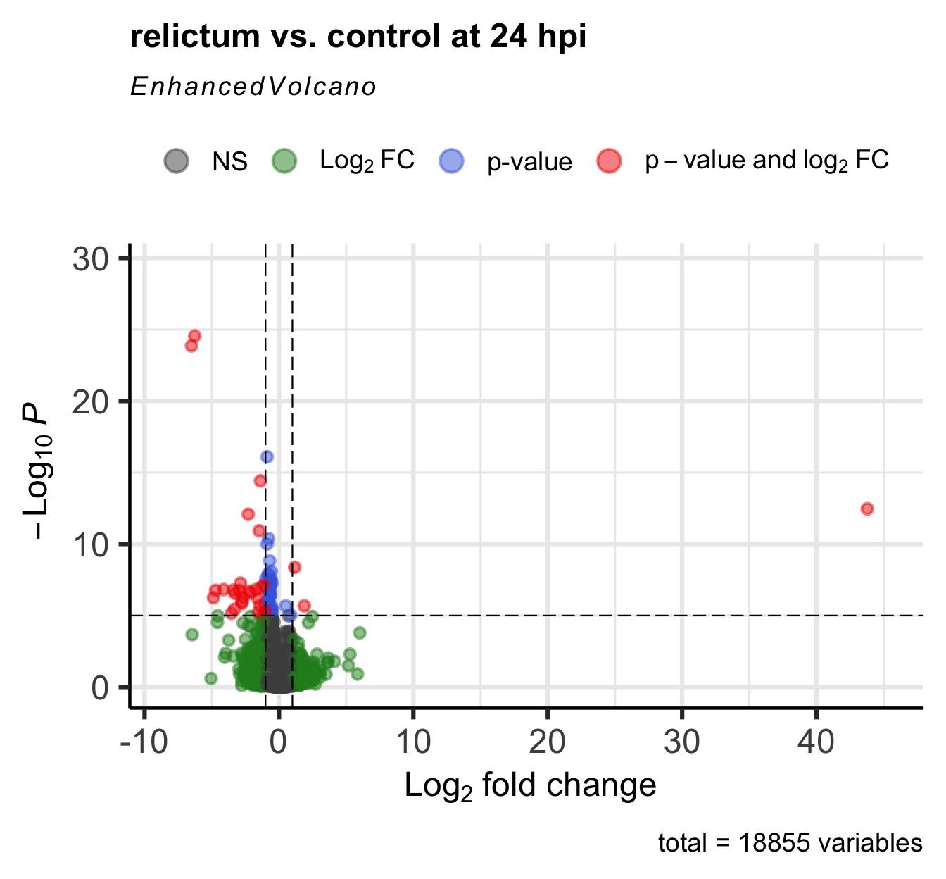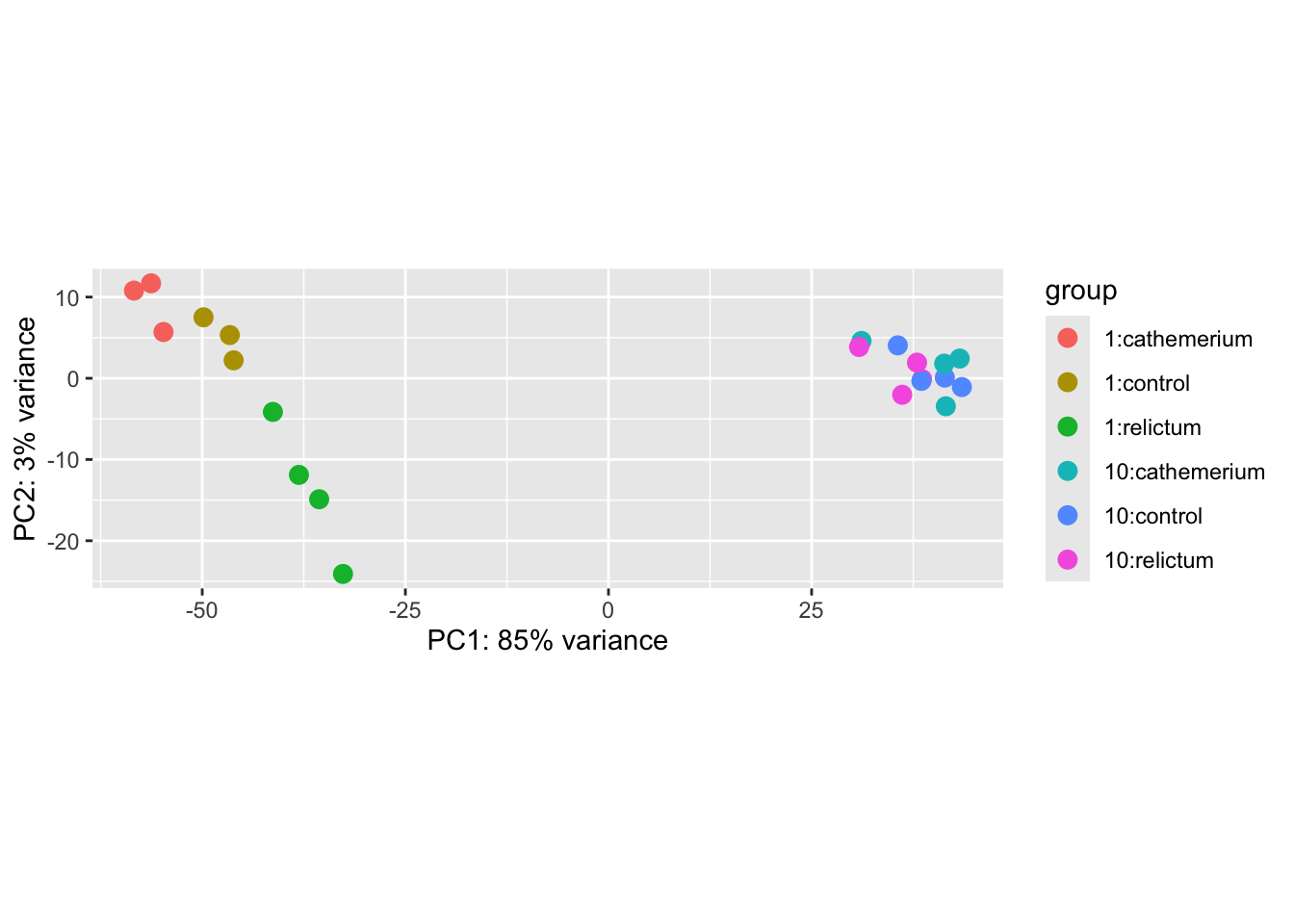 Our focal comparison is control_1 vs. relictum_1, and it looks like the difference between these two groups is solely due to the one outlier in relictum. Nevertheless, even the multiple-testing corrected p-value (padj) is significant for this gene: