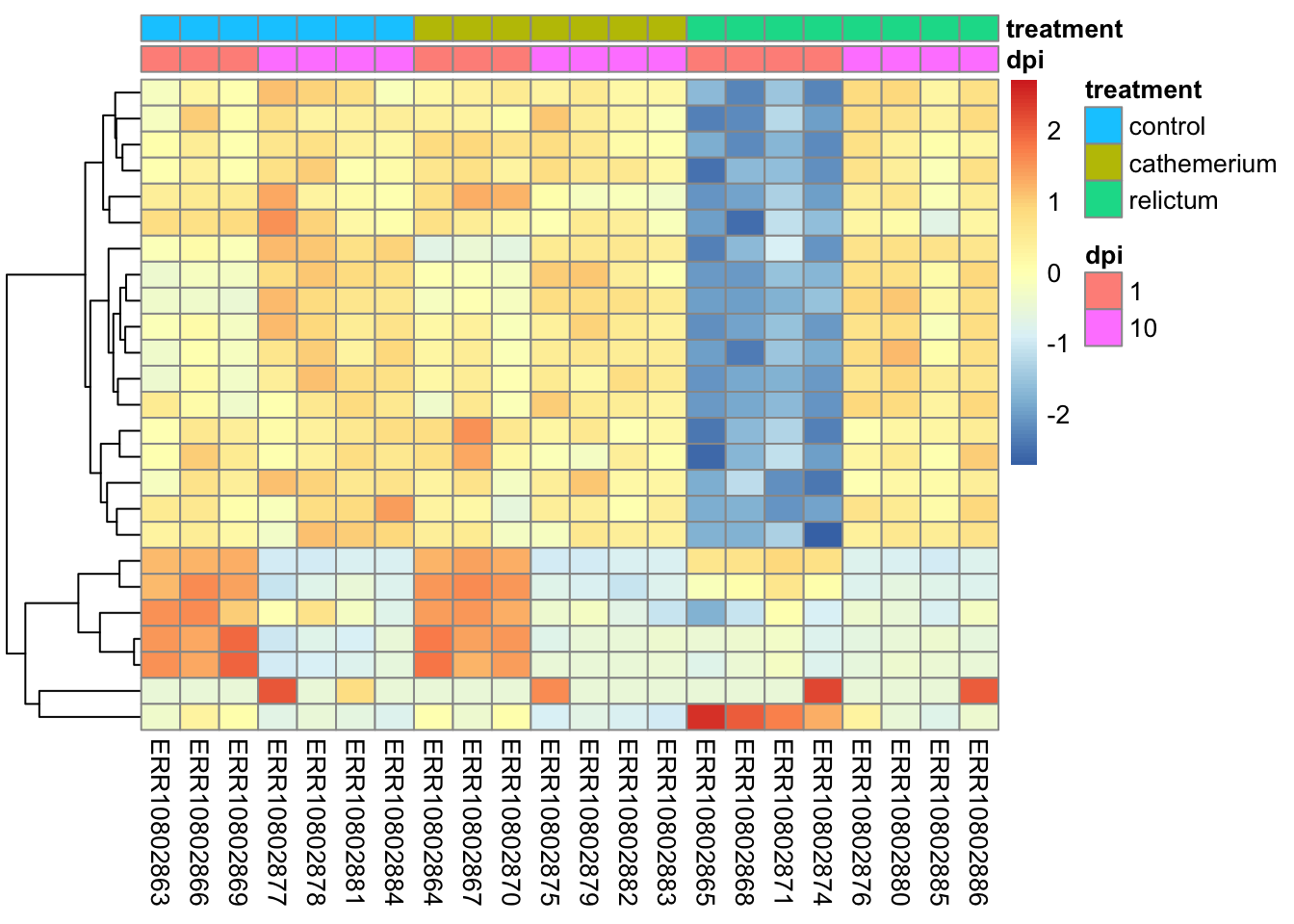 scale =will make sure we can compare genes with very different expression levels: after all, we’re interested in relative expression levels across samples/sample groupspheatmapwill by default perform hierarchical clustering both at the sample (col) and gene (row) level, such that more similar samples and genes will appear closer to each other. Above, we turned clustering off for samples to keep them in their groupwise order.