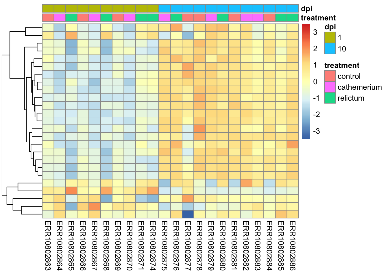 We will create heatmaps with the pheatmap function, and let’s make a heatmap for the top-25 most highly significant DEGs for the focal contrast. First, let’s install and then load this package:
