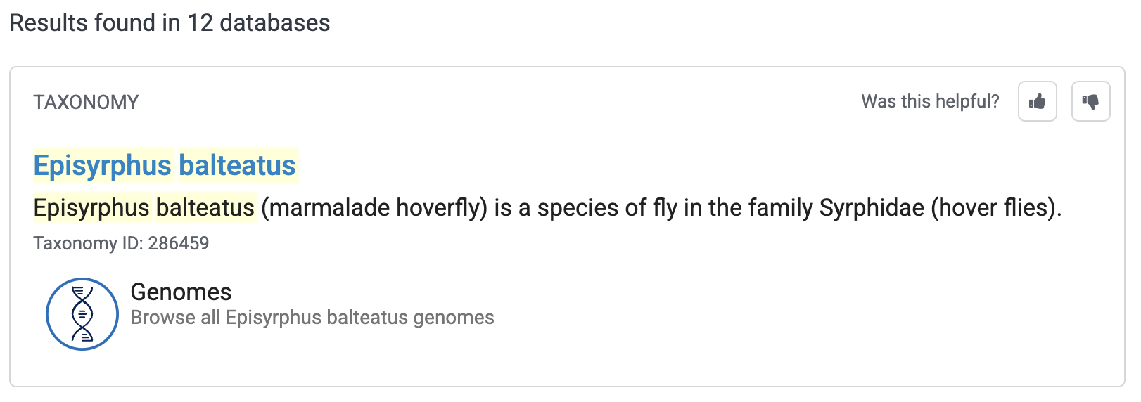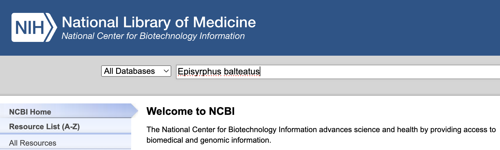 Generally, the first place to look for reference genome data is at NCBI, https://ncbi.nlm.nih.gov, where you can start by simply typing the name of your organism in the search box at the home page. By means of example, let’s first search for the hoverfly (also known as flower flies) Episyrphus balteatus: