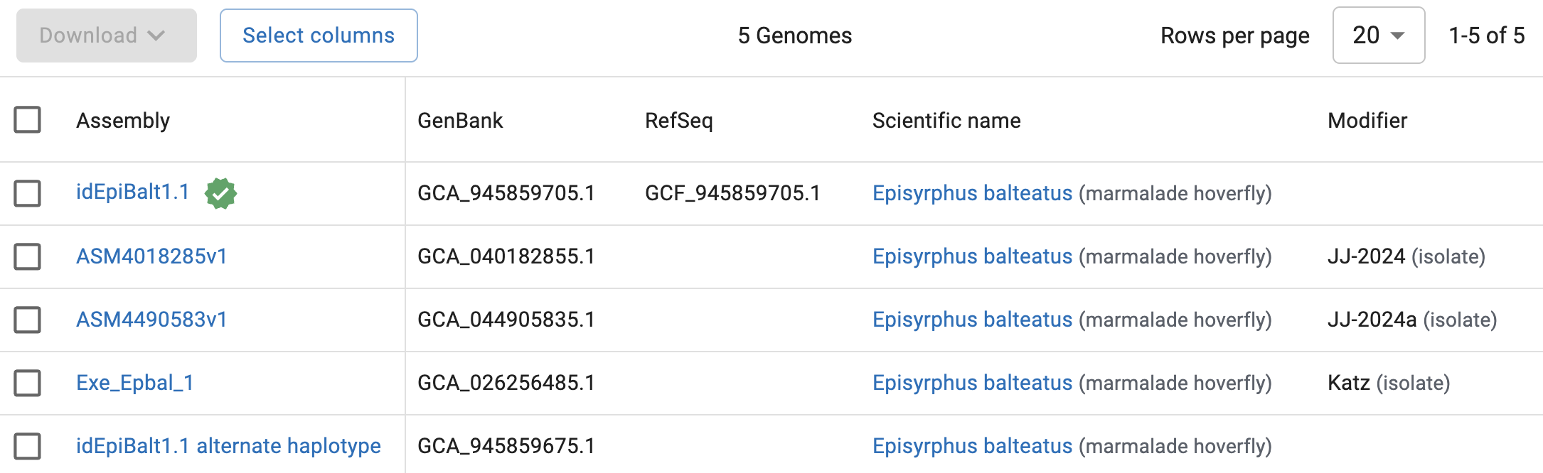 So, NCBI has 5 genomes assemblies for Episyrphus balteatus. The top one:
