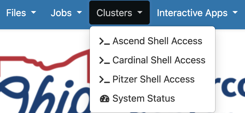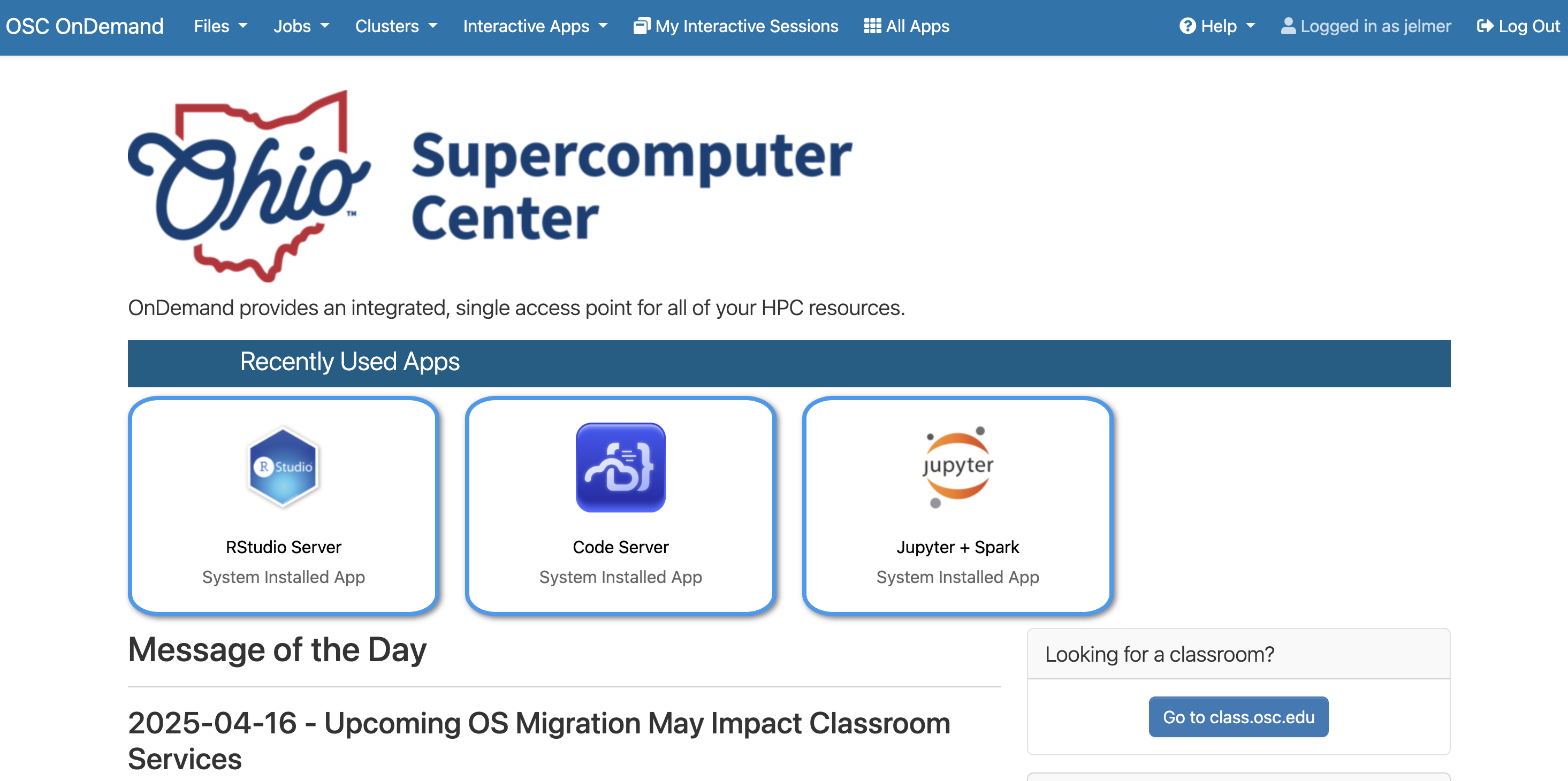 Go to https://ondemand.osc.edu. Use the username + password login option on the left-hand side to log in with your OSC (not OSU!) credentials. Once logged in, you should see a landing page similar to the one below: