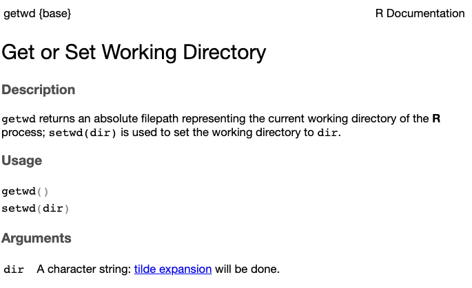 getwd() functionYou can also search for Help pages in that same RStudio Help tab.
