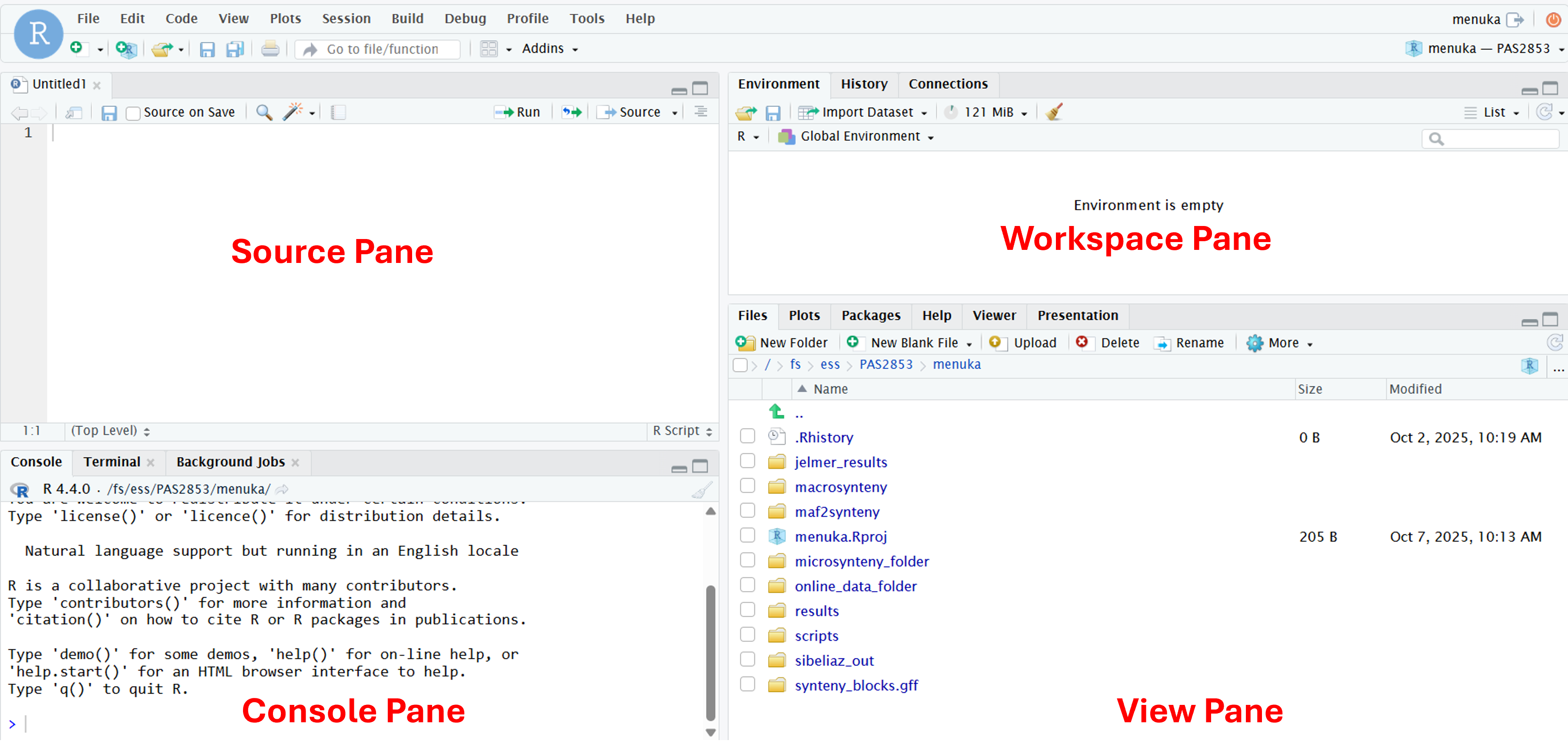 The default tab in this pane is “Files”, a file explorer. Also commonly used are e.g. Plots, where plots appear, and Help, for help info.