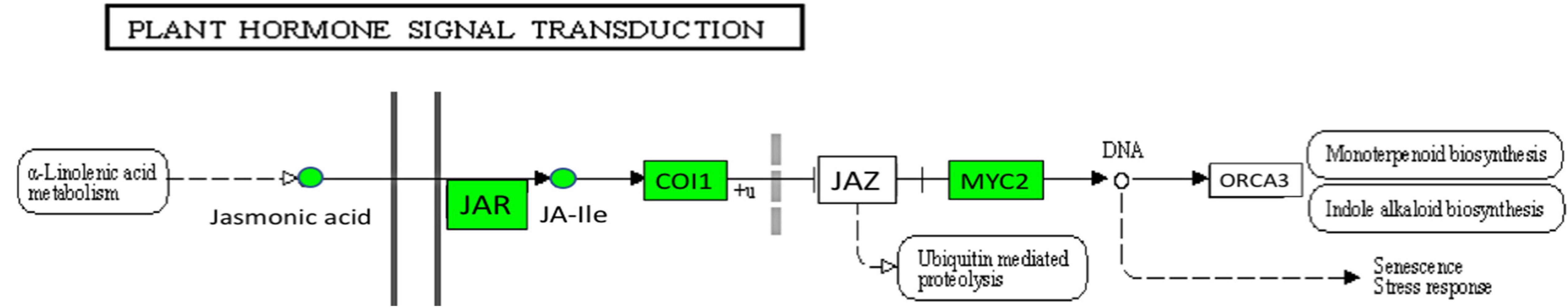 KEGG representation of up-regulated genes related to jasmonic acid (JA) signal transduction pathways (ko04075) in banana cv. Calcutta 4 after inoculation with Pseudocercospora fijiensis. Genes or chemicals up-regulated at any time point were highlighted in green.