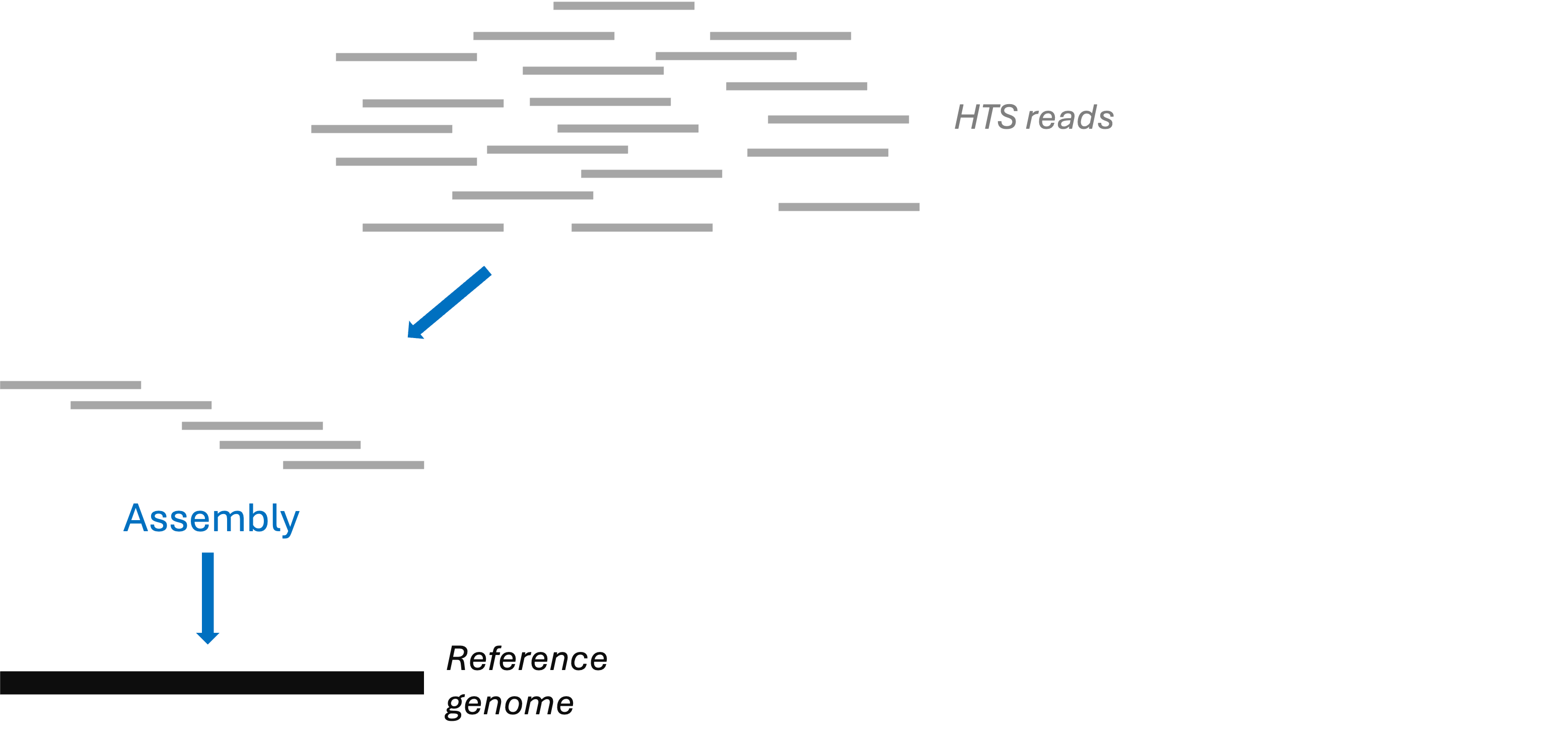 | Whole-genome assembly | The whole genome! 😃 | A single individual | “Overlap” reads into larger fragments |